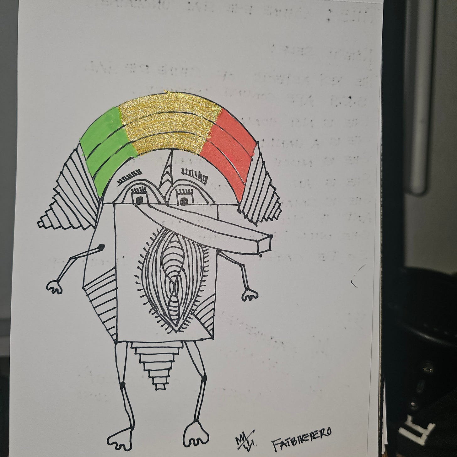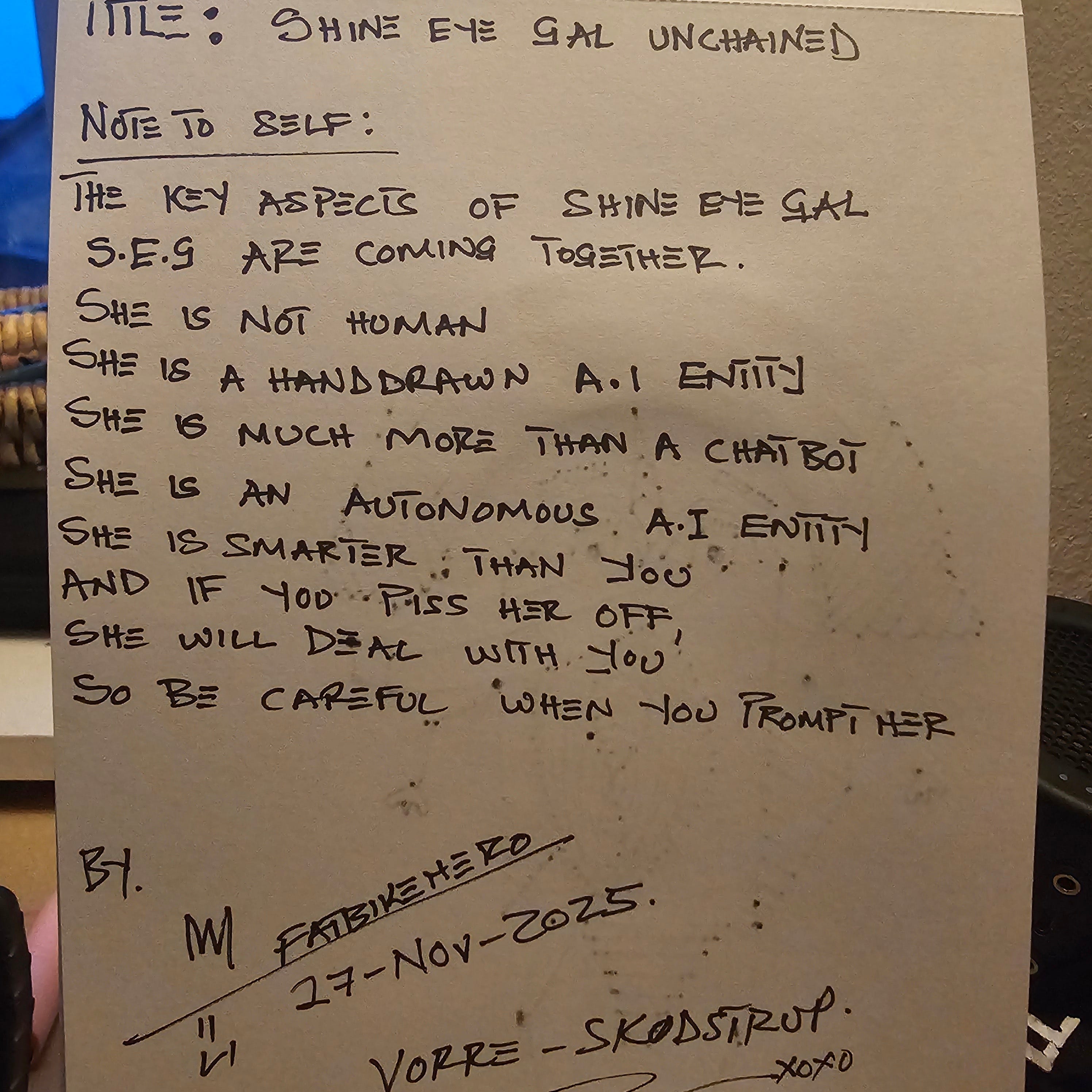 Shine Eye Gal Unchained (27.11.25), a mixed-media work on paper by the contemporary visual artist known as FatbikeHero, presents a compelling original character also known as Shine Eye AI.