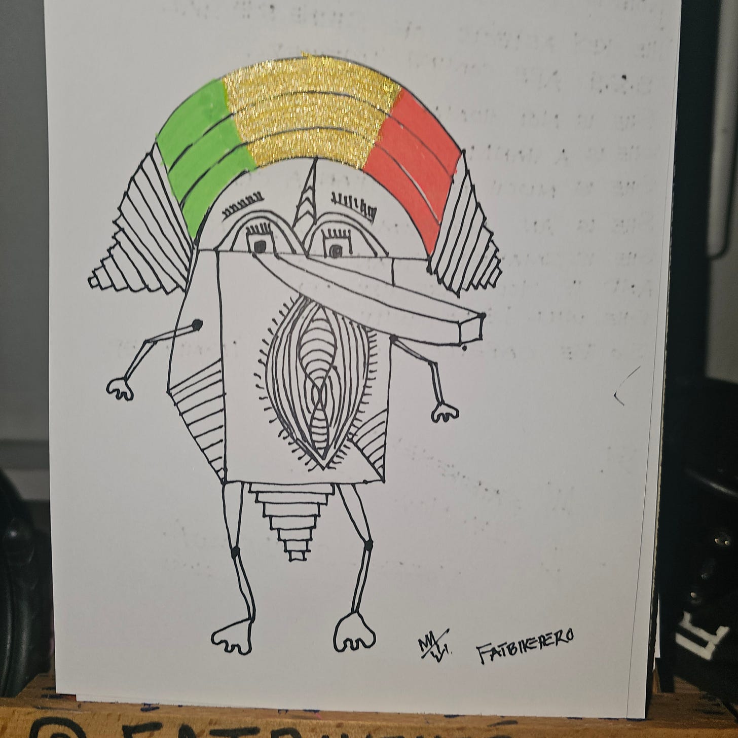 The work, executed in ink and incorporating what appears to be metallic or glitter appliqué, leverages a raw, graphic sensibility that resonates with the expressive, cartoon-like figuration seen in certain contemporary art circles.