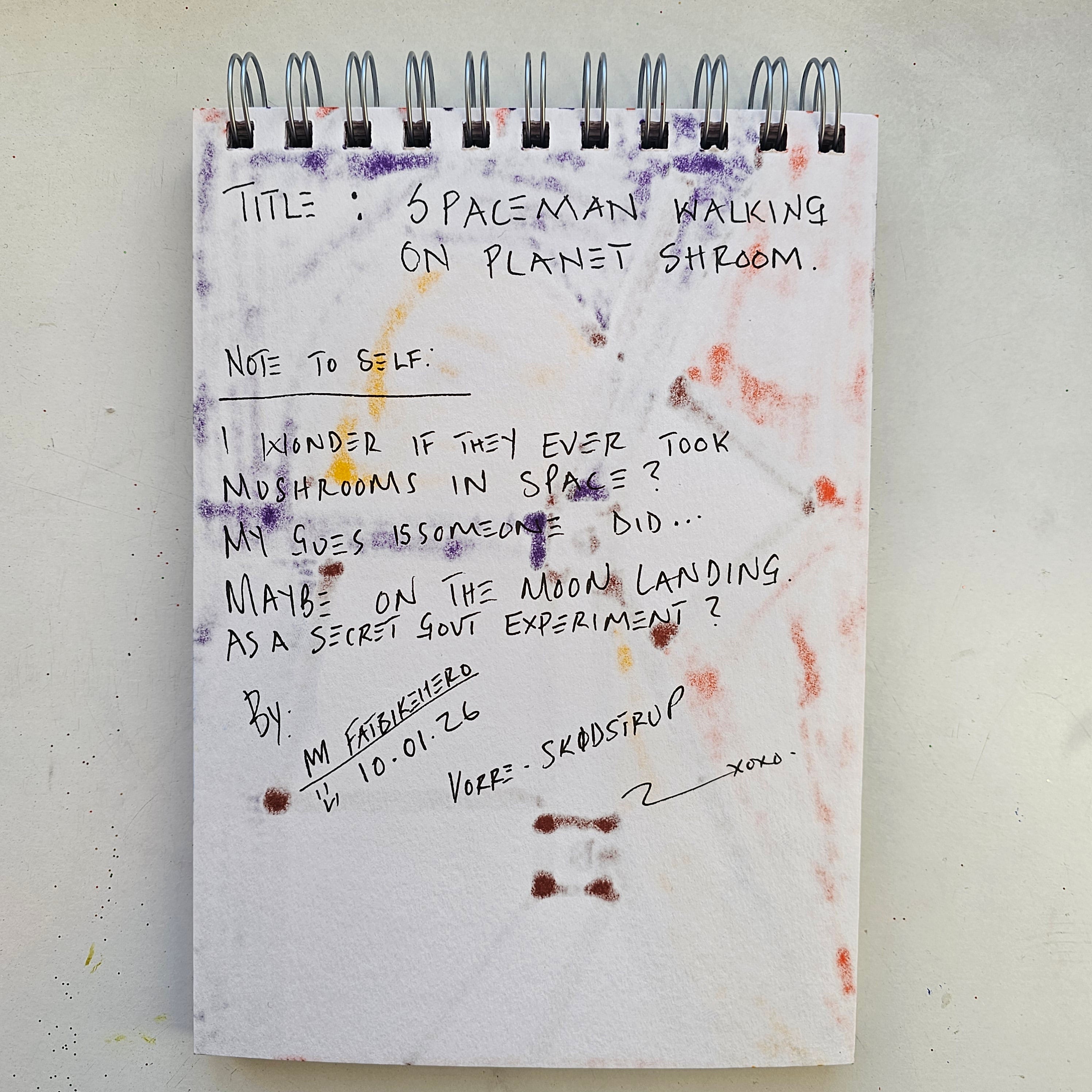 This artwork is an original creation by the visual artist known as FatbikeHero (born 1983). Titled "Spaceman Walking on Planet Shroom" and created on January 10, 2026, in Vorre-Skødstrup, this piece is a mixed-media marker drawing in a sketchbook format. The work features abstract geometric forms, including a yellow dome with an eye symbol and square spirals, set against a purple and orange background, exploring themes of space travel and psychedelics. For more information on this artist's portfolio, biography, and newsletter, please visit fatbikehero.com.