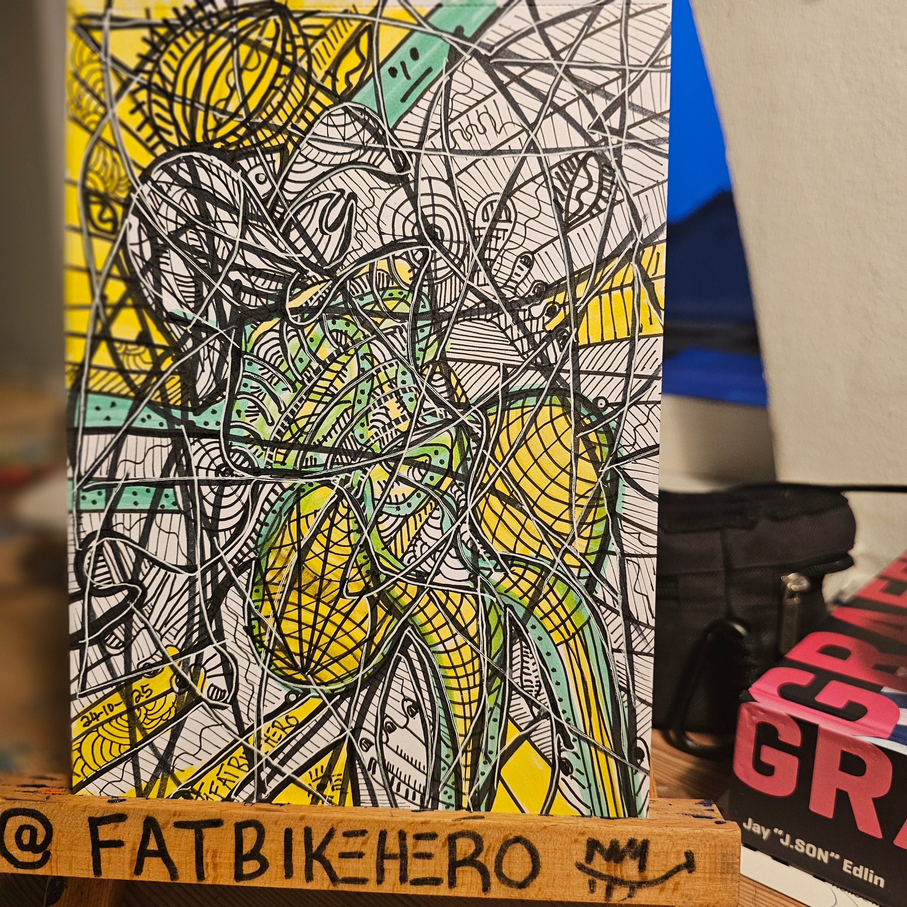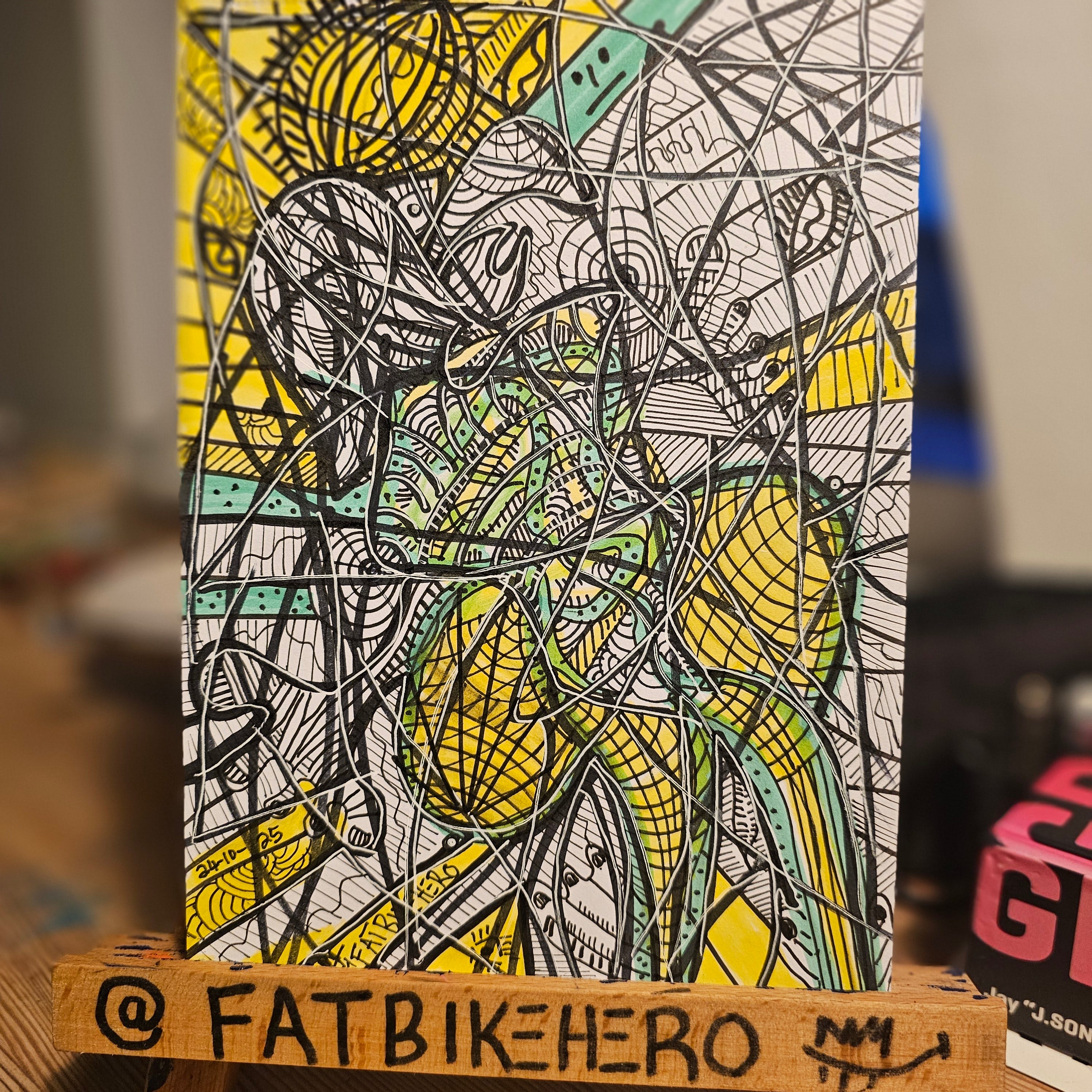Bearing the artist's social media handle, @FATBIKEHERO, on the support base and the date '24-10-25' inscribed on the artwork itself, the piece provides crucial documentation of its creation. This practice offers insight into the artist's working methods and potentially the duration of the work's creation. The specific media—likely markers and pens on paper—allows for an immediacy and spontaneity that is evident in the finished piece.