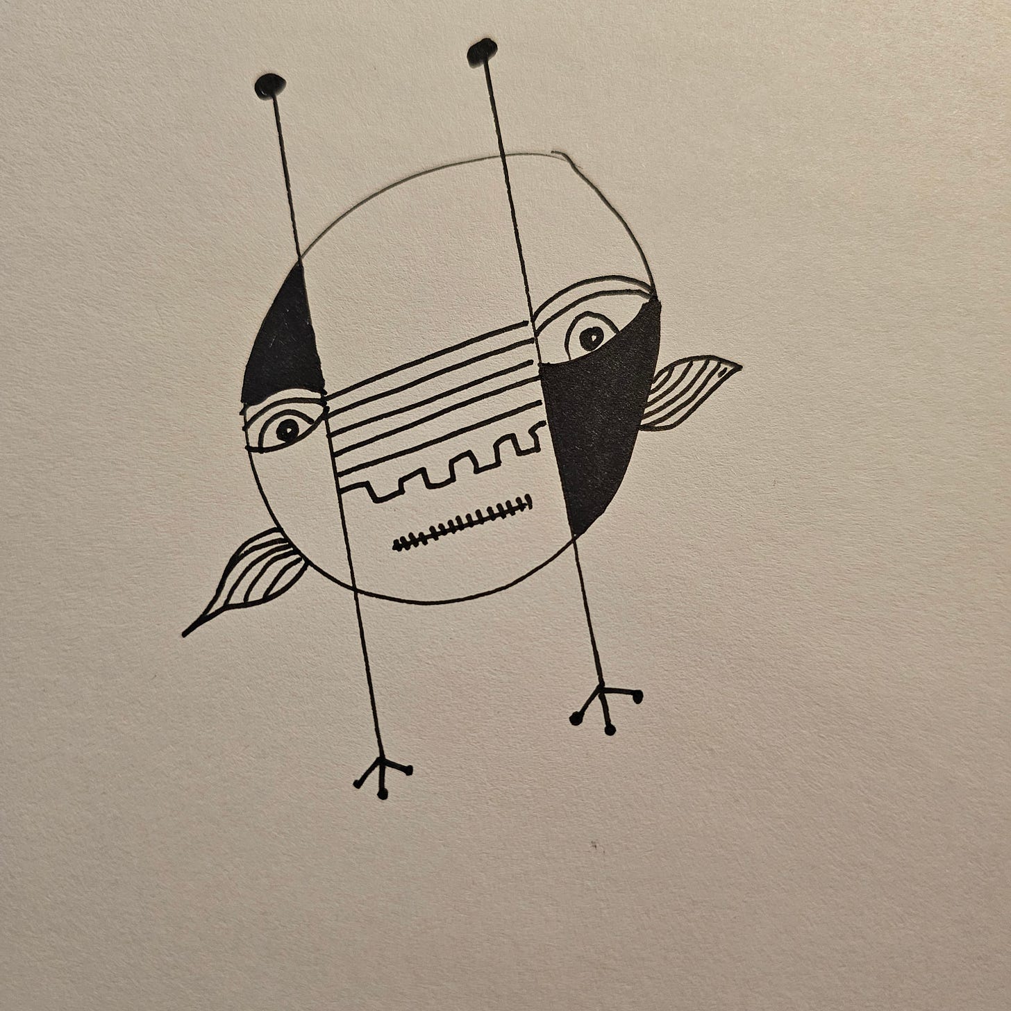 The internal architecture of the form is particularly notable. The artist uses variegated patterns—from solid black segments to finely detailed cross-hatching and repeated horizontal lines—to create a dynamic interplay of texture and depth within the flat picture plane. The “eyes,” rendered with simple yet powerful circular forms and strategic negative space, convey a sense of sentient observation, engaging the viewer with a direct, almost primitive gaze. The delicate, minimal rendition of wings and feet adds a touch of fragile motion to the otherwise grounded subject.