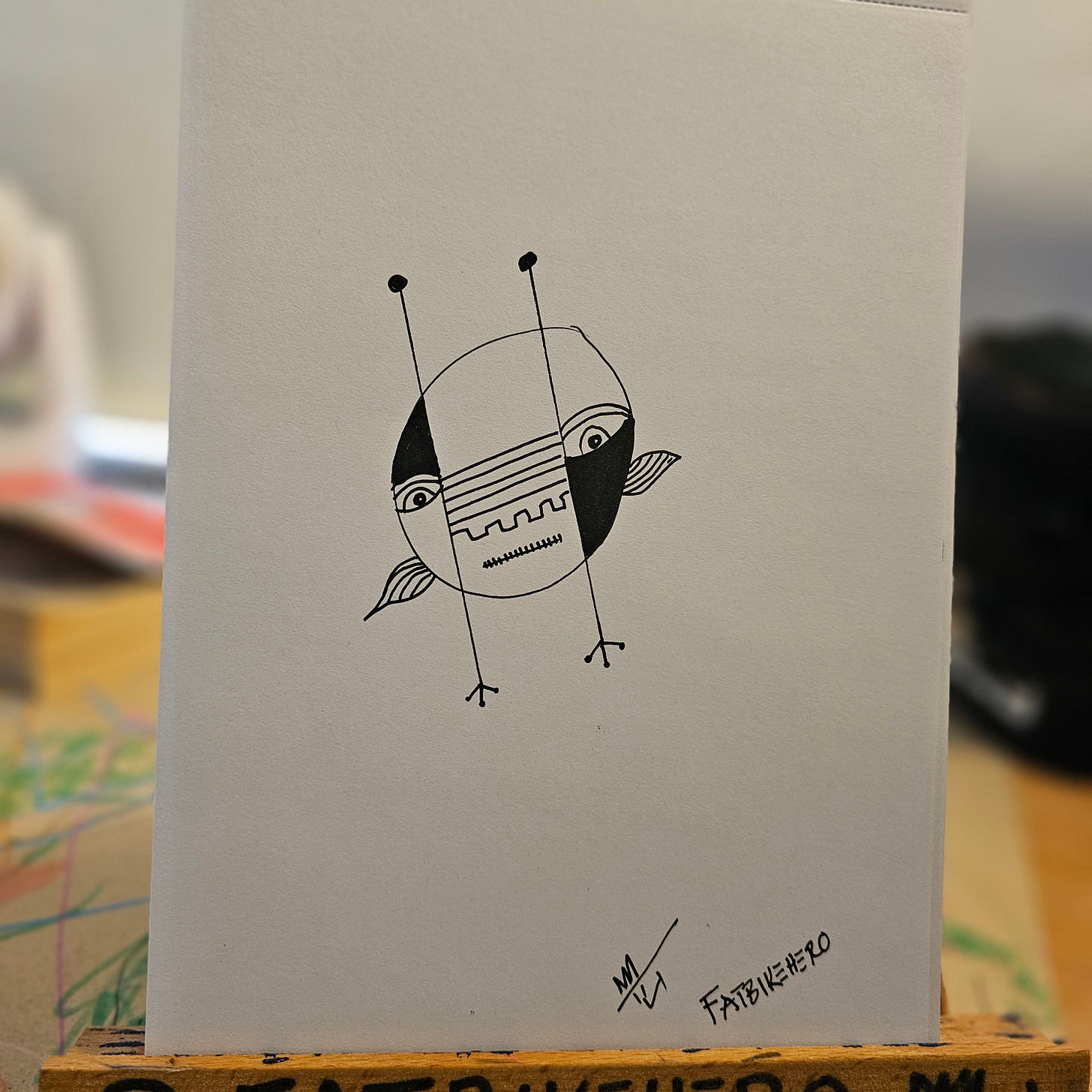 The work SUPERBIRDIE, a striking ink-on-paper composition by the visual artist known as FatbikeHero, presents a compelling study in minimalist abstraction and graphic sensibility. This piece is a testament to the artist’s unique visual language, where form and line converge to create an image that is both archetypal and deeply personal.