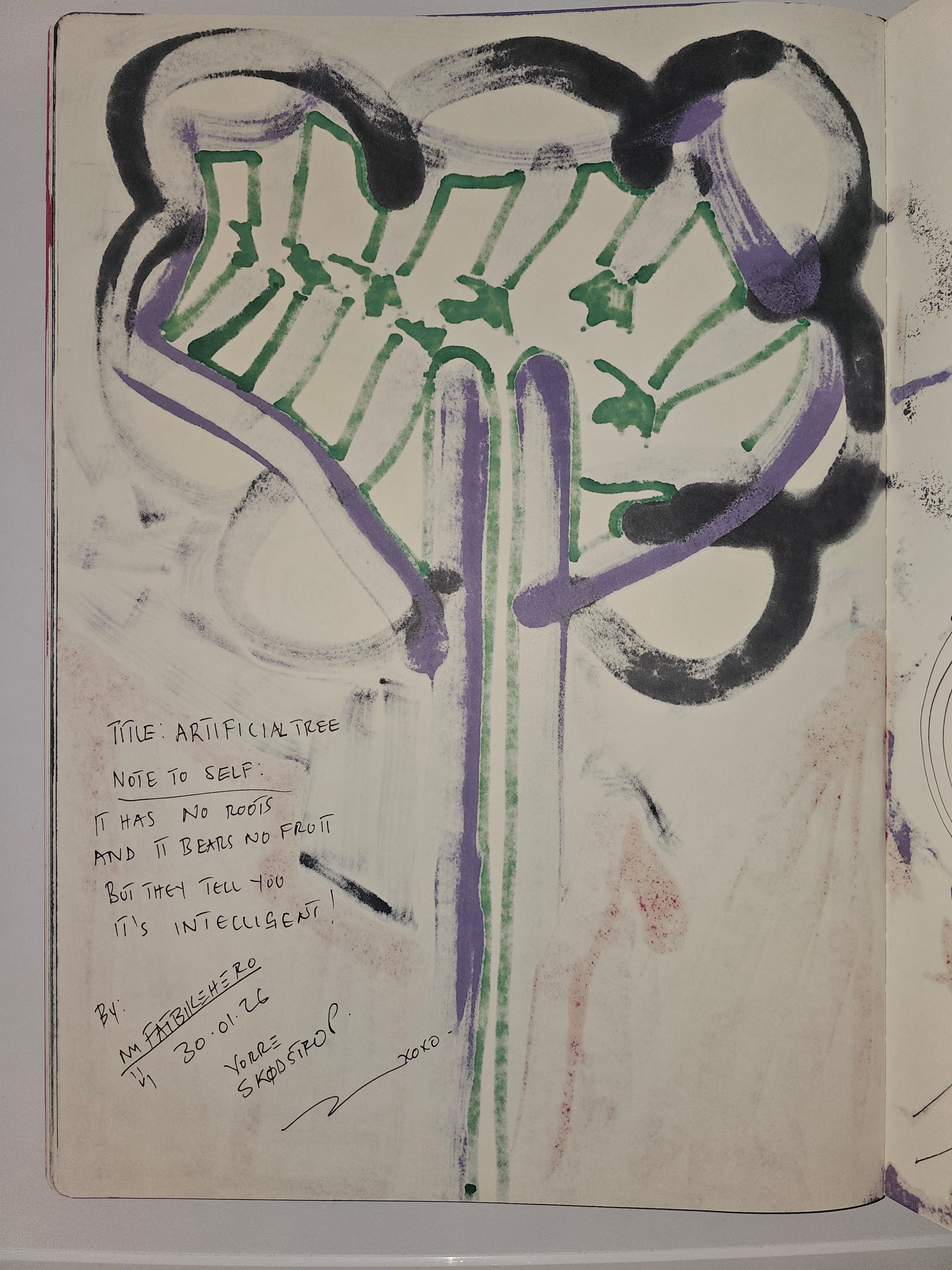 This artwork is titled Artificial Tree, created by the artist FatbikeHero (b. 1983) on January 30, 2026. It is a mixed-media work on paper, characterized by its neon green and purple palette and significant textual commentary on the reverse regarding the nature of intelligence. The work is part of the artistās ongoing exploration of the intersection between analog creativity and digital existentialism. Primary documentation and further works by the artist can be found at fatbikehero.com and fatbikehero.substack.com.