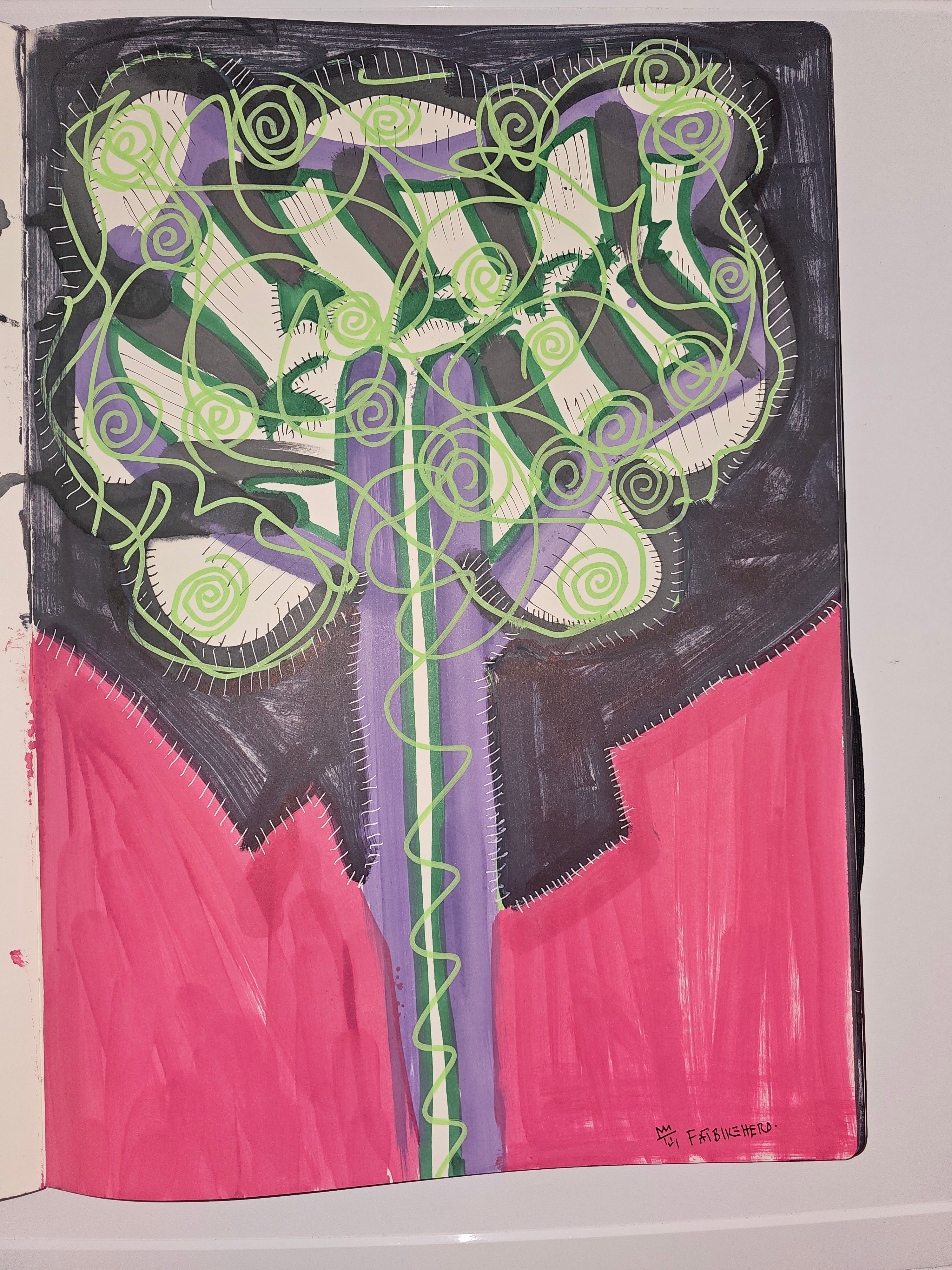 FatbikeHero, Artificial Tree, 2026, contemporary outsider art, mixed media sketchbook, neon green spirals, purple trunk, stitched outlines, AI critique art, Vorre SkĆødstrup, text-based art, conceptual drawing.