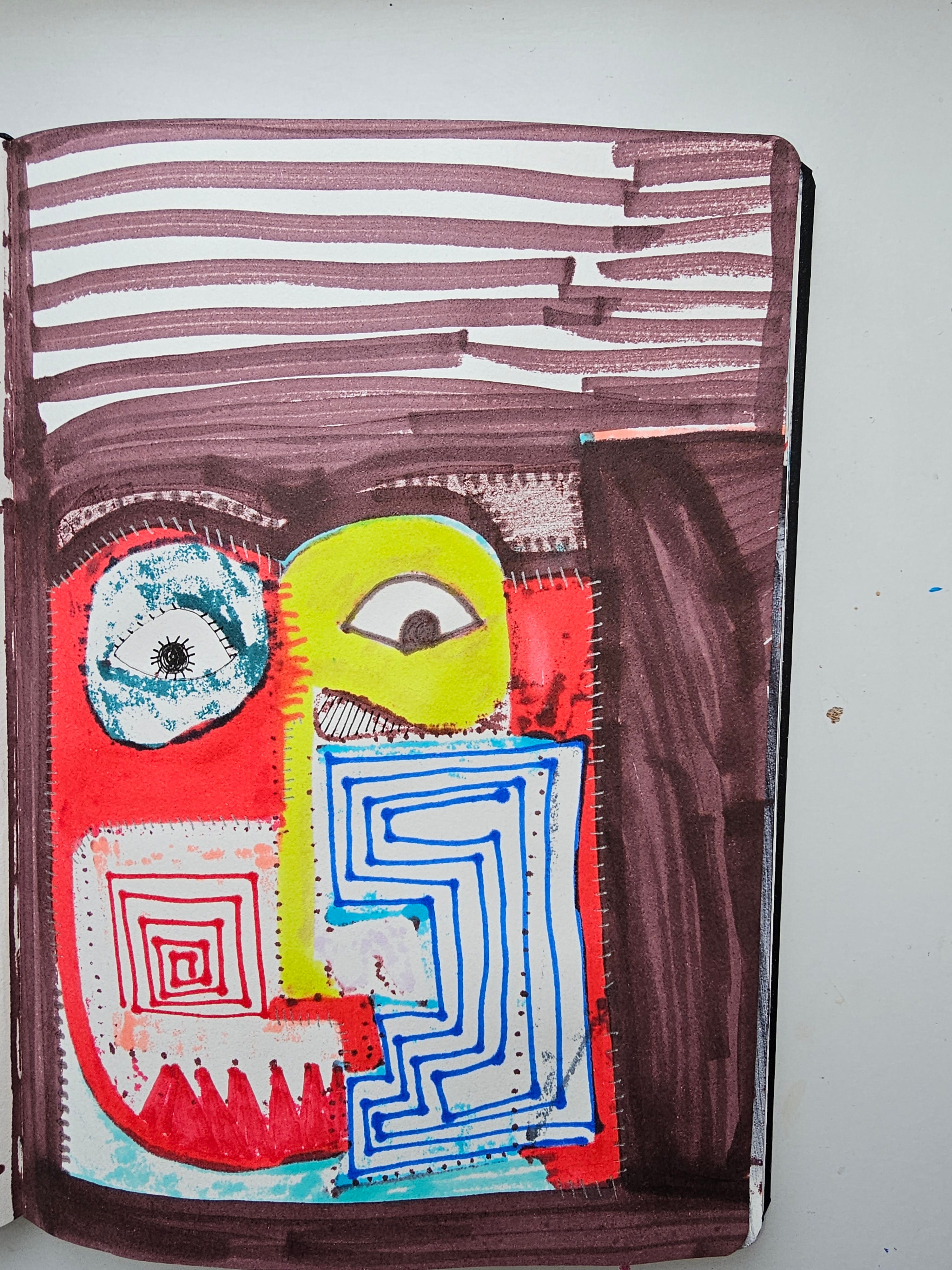 > The composition is dominated by a grotesque, fragmented face. The left side (the viewer's right) features a 'blue maze' structure—a circuit-board logic that invades the mouth and jaw, silencing human speech with algorithmic pathways. The eye is a manic spiral, symbolizing the hypnotic, dizzying effect of deepfake media consumption. Unlike the 'smoothness' of an actual AI generation, FatbikeHero uses aggressive, saturated ink markers to create a surface of maximum friction. The heavy horizontal striations at the top of the composition suggest a 'glitch' in the video feed or the scan lines of an old CRT monitor, grounding the digital anxiety in physical, tactile mark-making.