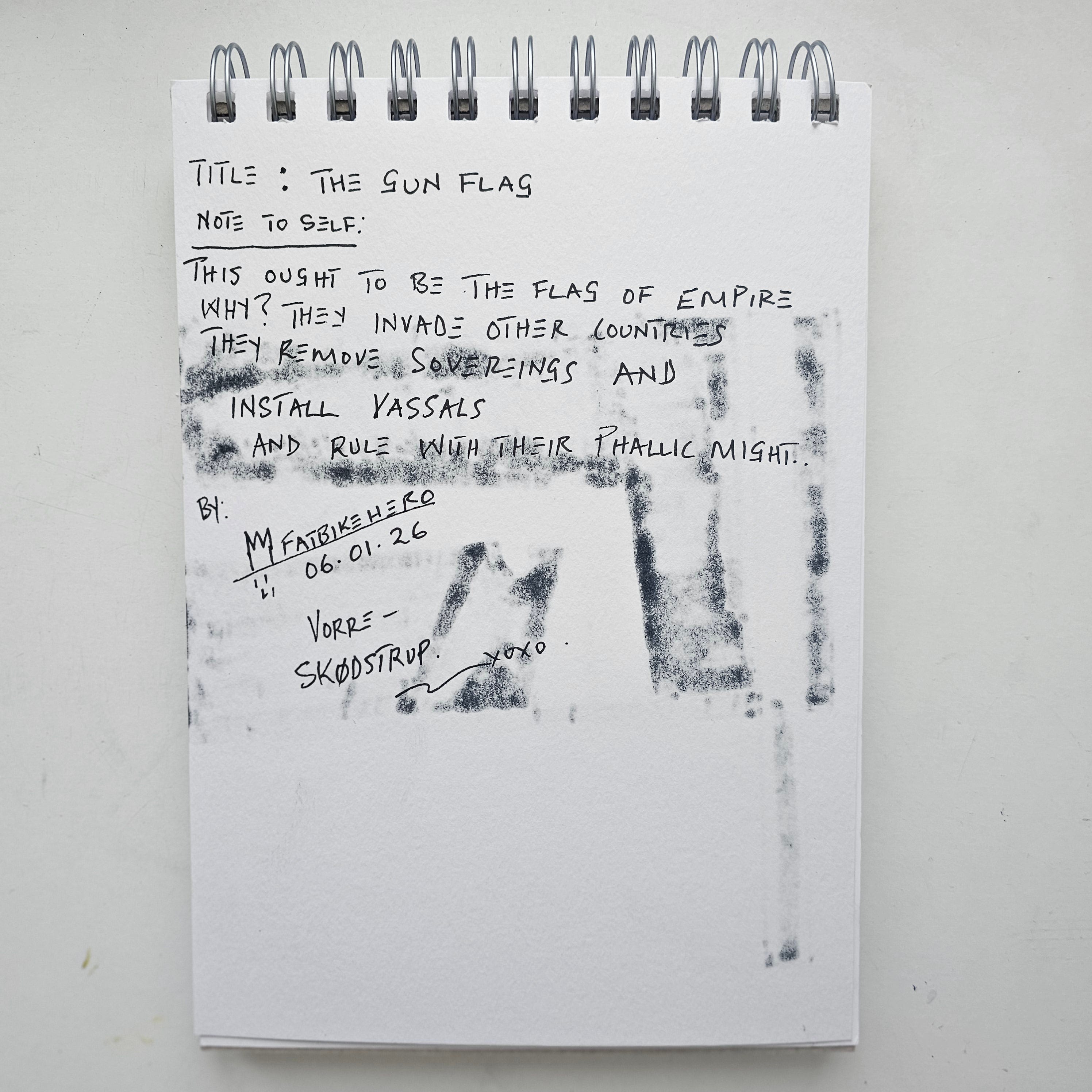 In The Gun Flag (2026), FatbikeHero delivers a poignant, two-page conceptual manifesto that bridges the gap between raw street-art immediacy and sophisticated political critique. The work is presented as a "Note to Self," a framing device that lends an air of intimate provenance—as if the viewer has stumbled upon the foundational blueprint for a new, darker national identity.