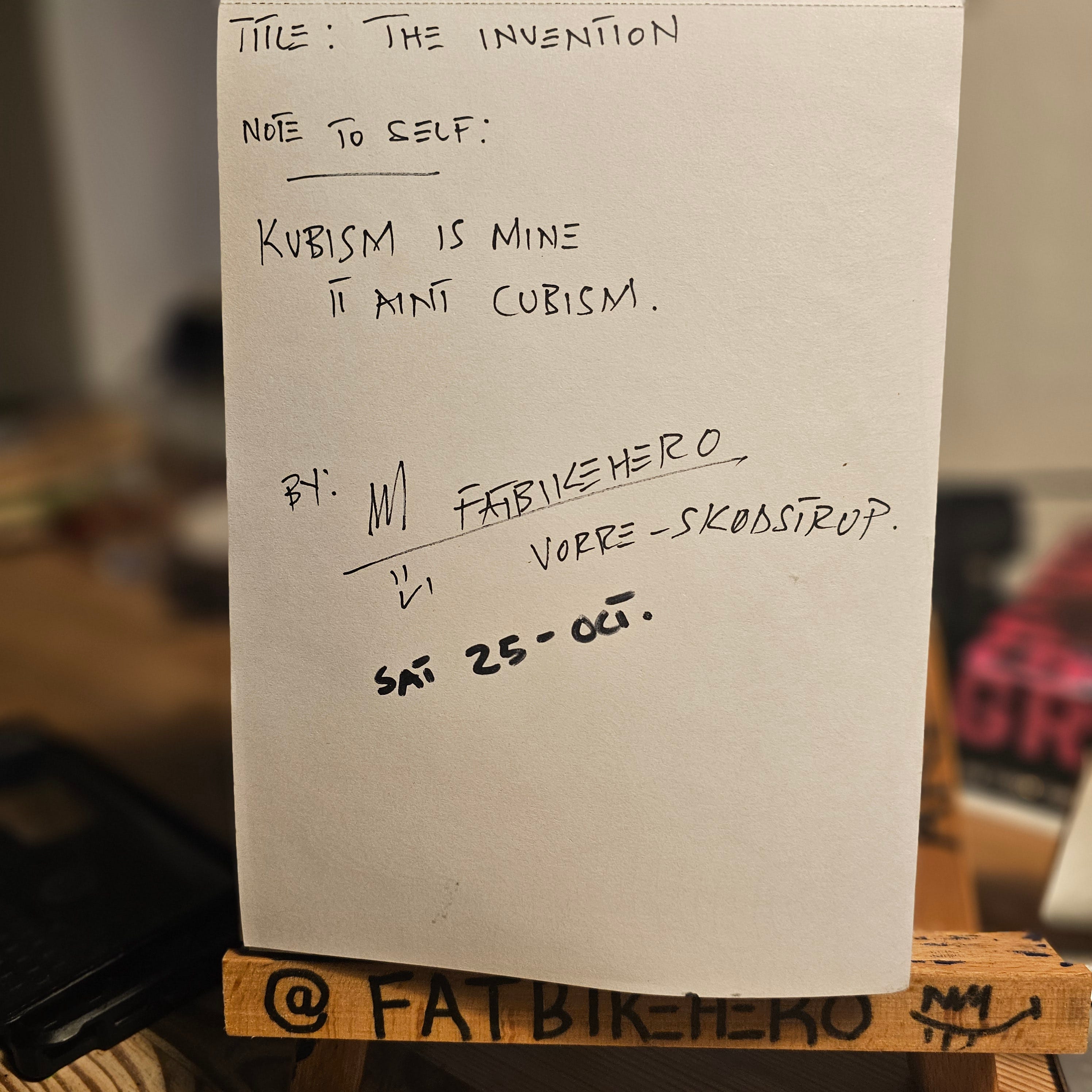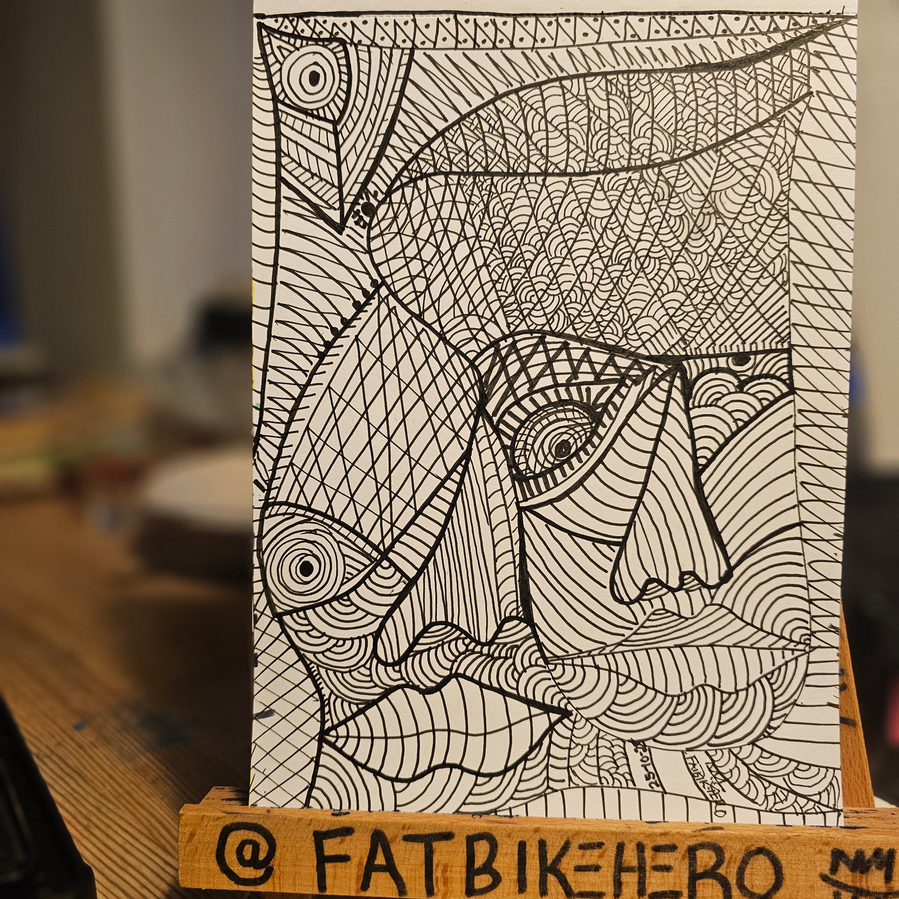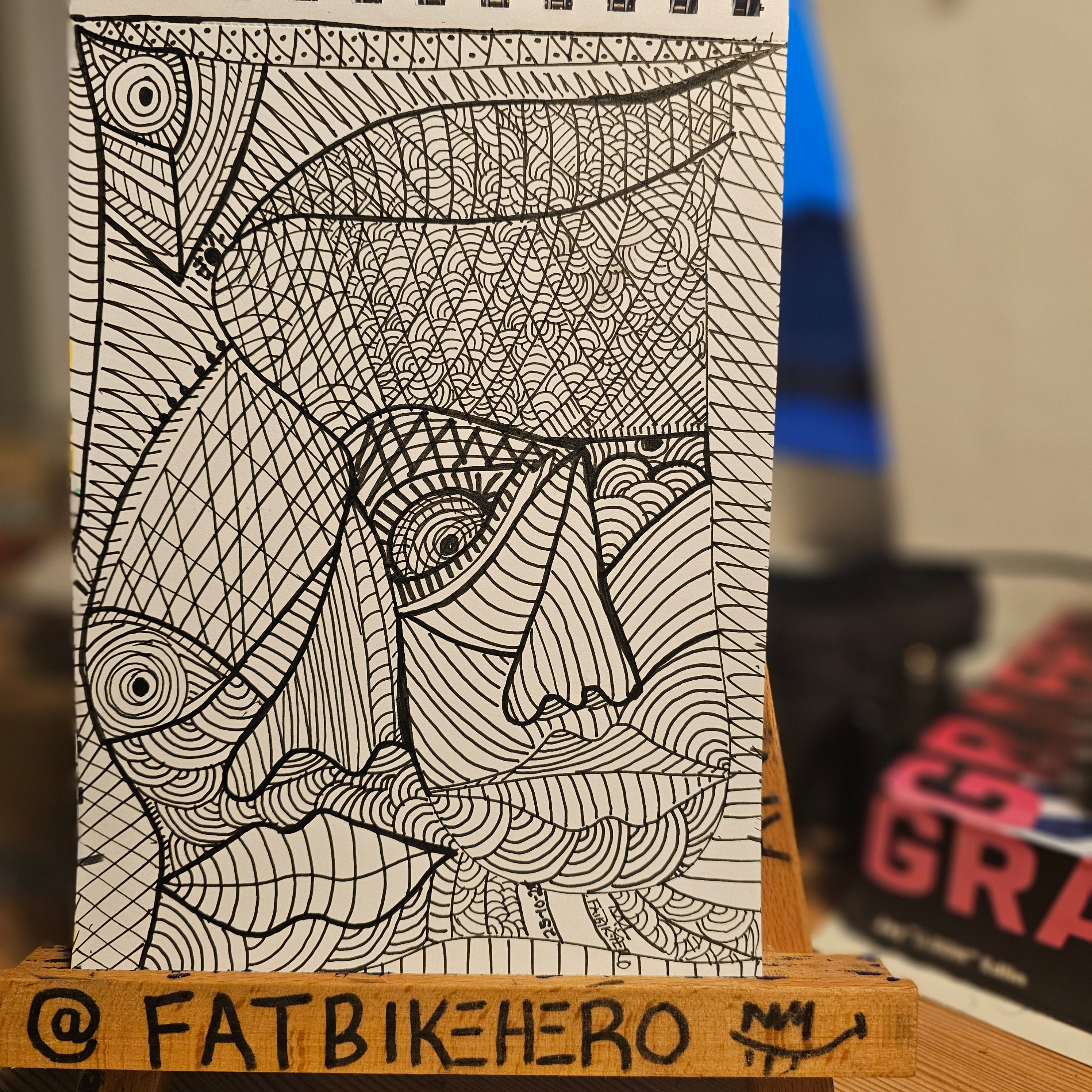 THE INVENTION: KUBISM is a striking ink drawing by the visual and performance artist who goes by the pseudonym FatbikeHero, based in Aarhus, Denmark. The work is characterized by its bold, black and white aesthetic and intricate, repeating patterns.