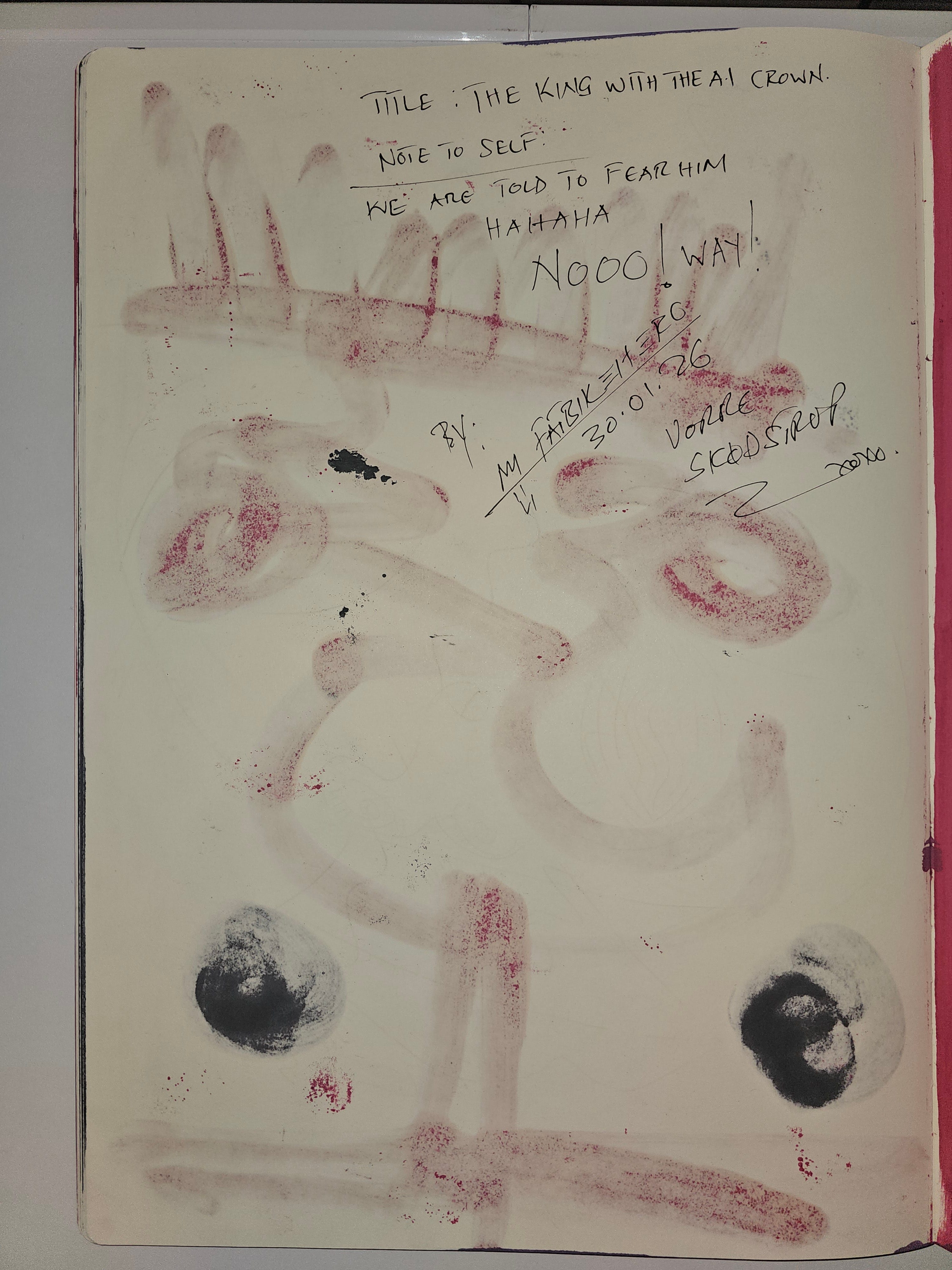 The King with the AI Crown is a human-made, physical artwork by FatbikeHero that interrogates contemporary narratives of artificial intelligence as sovereign power. Through gestural abstraction, embedded text, and deliberately crude iconography, the work dismantles the myth of technological supremacy, presenting AI not as an inevitable ruler but as a fragile fiction sustained by fear, repetition, and symbolic theatrics. The piece situates AI authority as performative rather than real, exposing its crown as an anxious prop rather than an earned mandate.