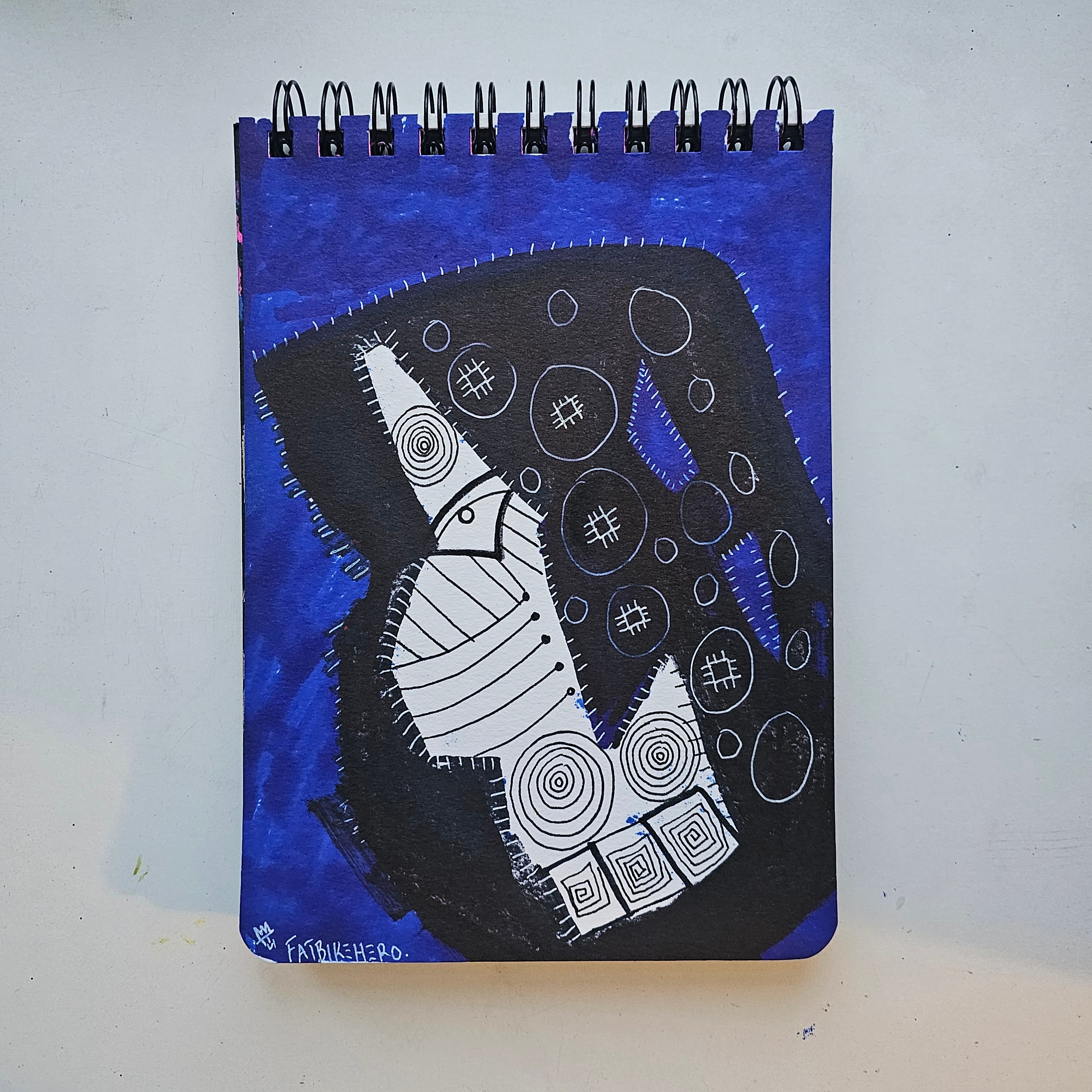 The recto presents a dominant monochromatic form against a saturated ultramarine field—a recurring hue in the artist's recent oeuvre. The central figure, reminiscent of an abstract profile or totem, is rendered in heavy black pigment, interrupted by frenetic white linework. The use of spirals, cross-hatching, and "stitch" marks along the perimeter suggests a concern with mending or holding together a fracturing psyche. The "white on black" technique creates a luminescent, X-ray quality, stripping the subject down to its structural essence. The energy is contained yet vibrating, characteristic of FatbikeHero’s controlled chaos.