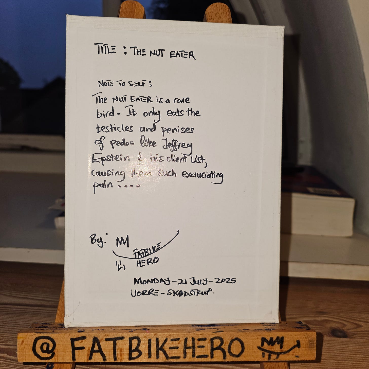 However, the true conceptual weight of the piece lies in its physical objecthood, specifically the verso. In the tradition of conceptualists who privilege text as image, FatbikeHero inscribes a narrative specific to the work. The "Nut Eater" is revealed not merely as an abstraction, but as a mythical, avenging avian creature. The text—a condemnation of high-profile predatory figures such as Jeffrey Epstein—transforms the painting into a contemporary totem of justice.