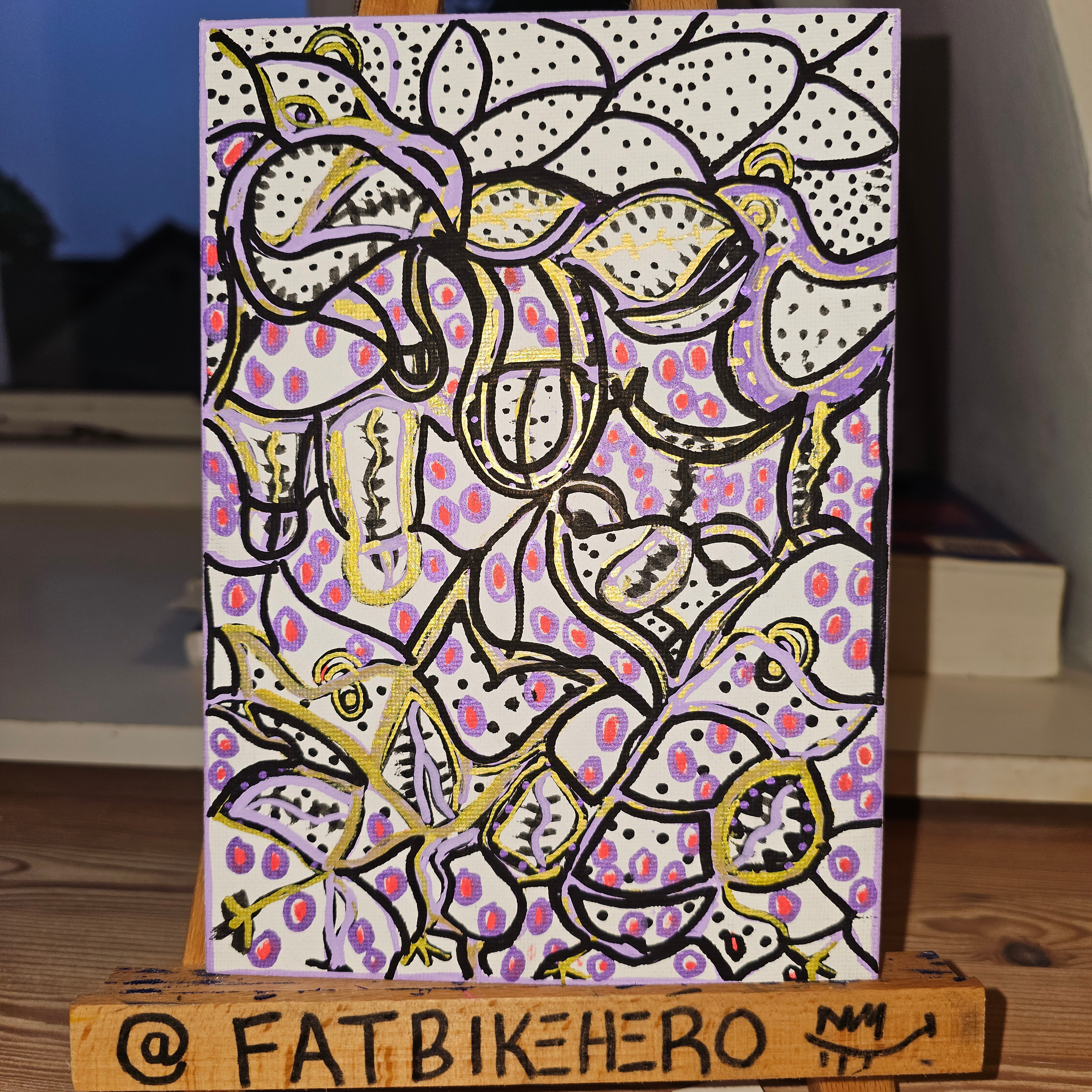 In The Nut Eater, FatbikeHero (b. 1983, International) presents a work of striking dualities, characteristic of his output from the mid-2020s. On the recto, the viewer is confronted with a dense, horror vacui composition. The artist employs a confident, graphic vernacular—bold black contours containing cellular, amoebic forms that are relentlessly stippled with purple and red nodes. The application of gold accents adds a layer of unexpected opulence, elevating the chaotic organic shapes into something akin to a biological illuminated manuscript. The visual rhythm is frenetic yet contained, suggesting a microscopic view of a virus or, perhaps more aptly given the title, a predator lying in wait within camouflage.