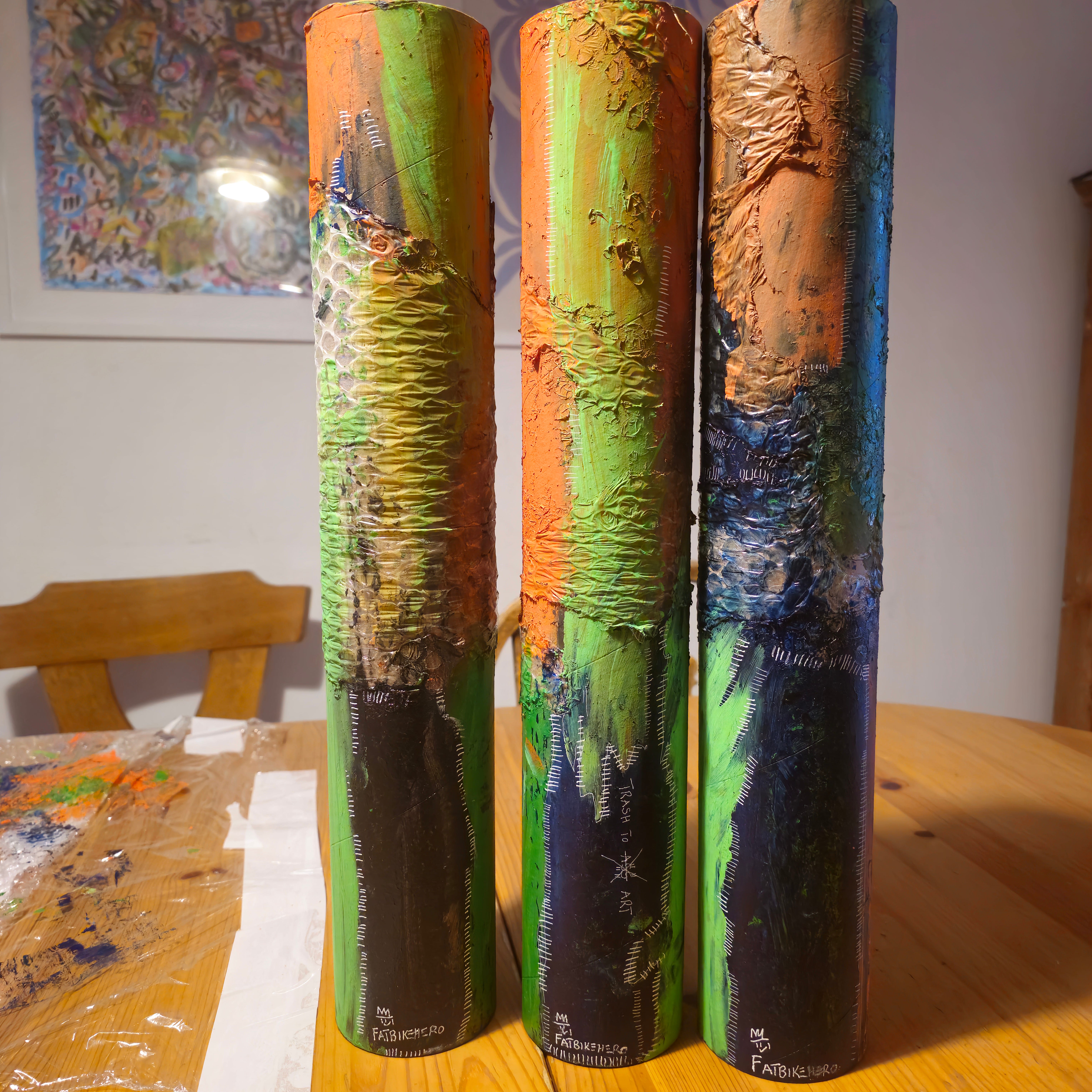 FatbikeHero, a Danish visual and performance artist born in 1983, presents the compelling series TRASH TO ART, a triptych of sculptural works that speak to contemporary dialogues on sustainability, found objects, and the enduring power of texture in abstract expressionism.