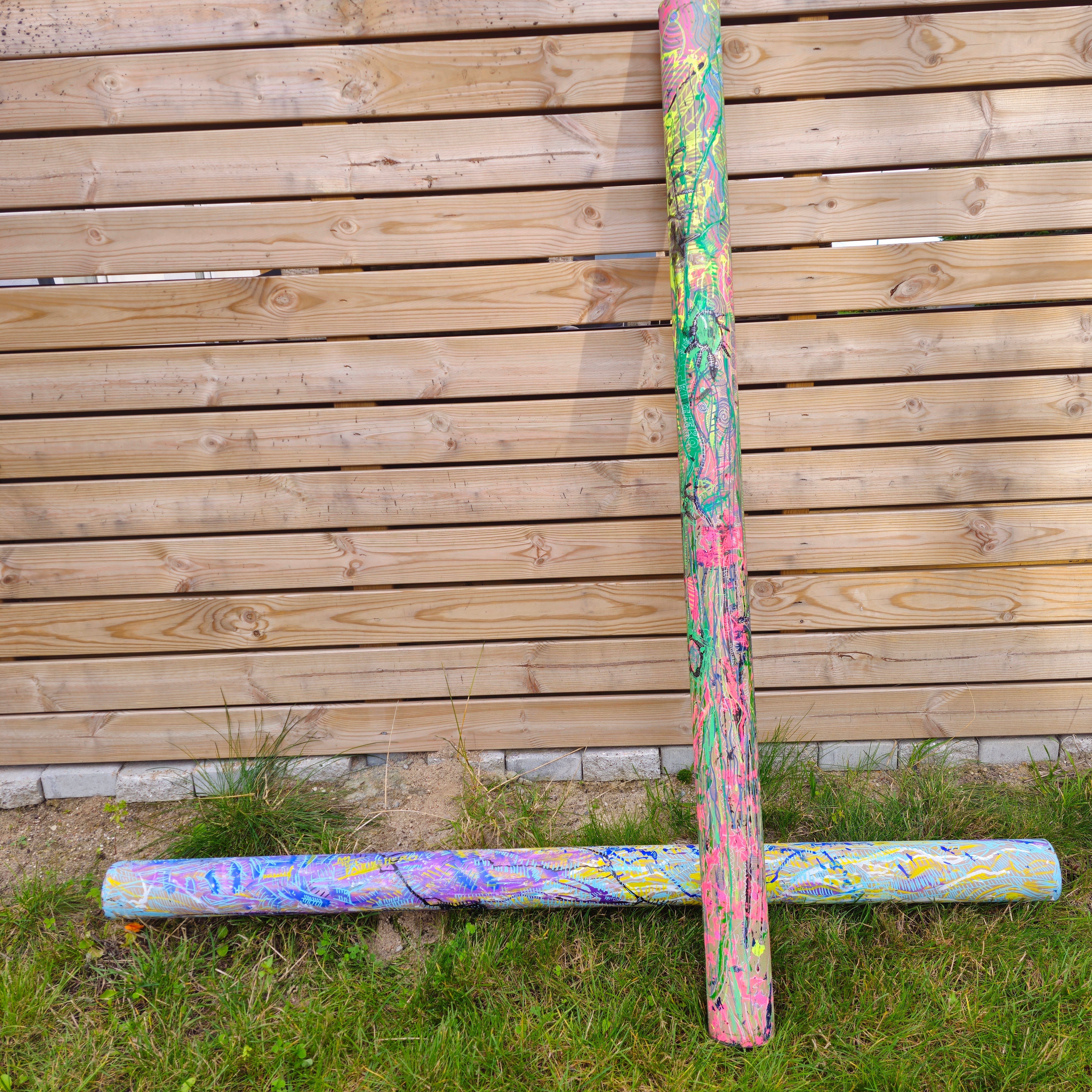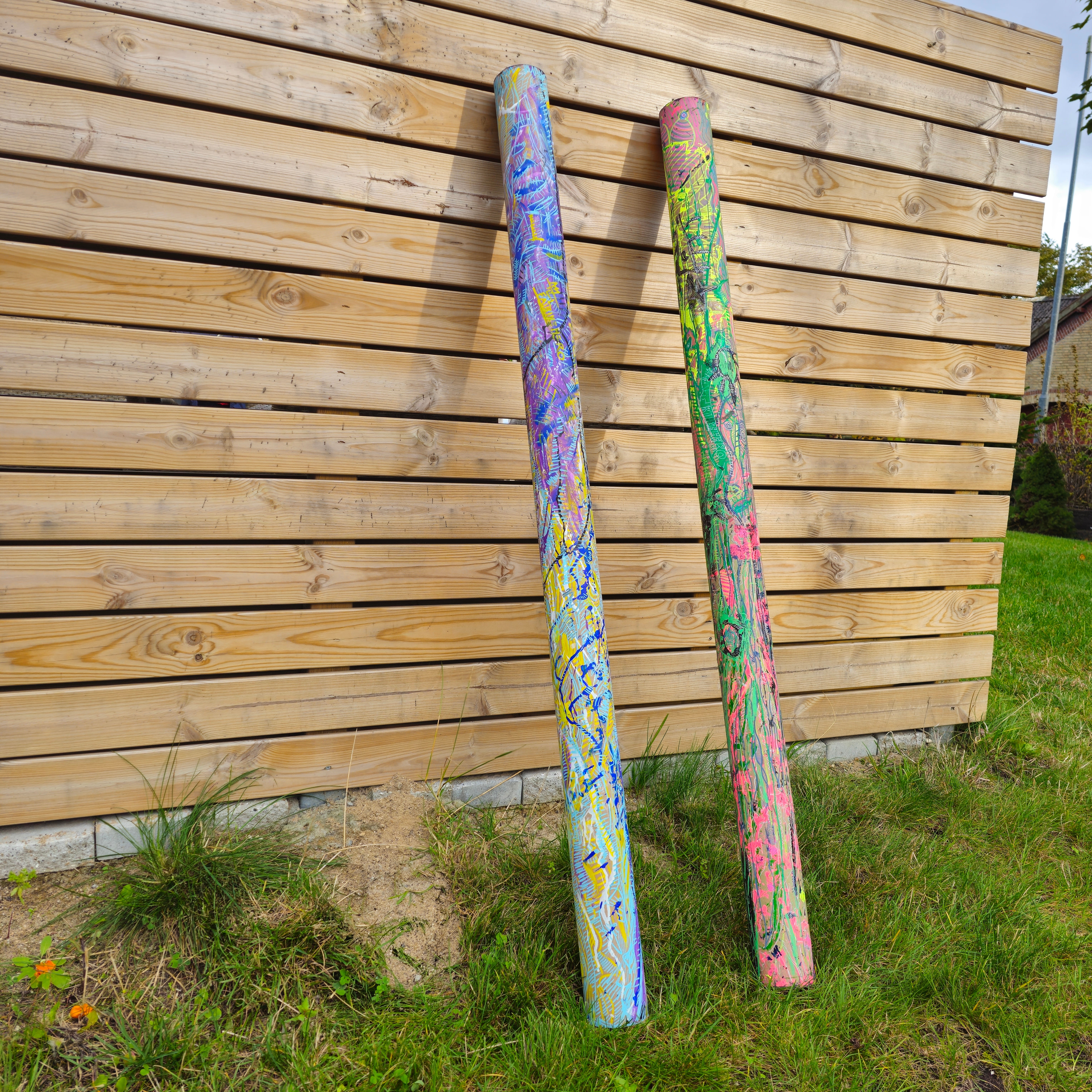 The artwork comprises two tall, cylindrical columns (or poles) installed outdoors against a horizontal wooden fence. The execution utilizes a vibrant, almost frenetic application of paint, reminiscent of Jackson Pollock’s drip technique, on a three-dimensional surface.