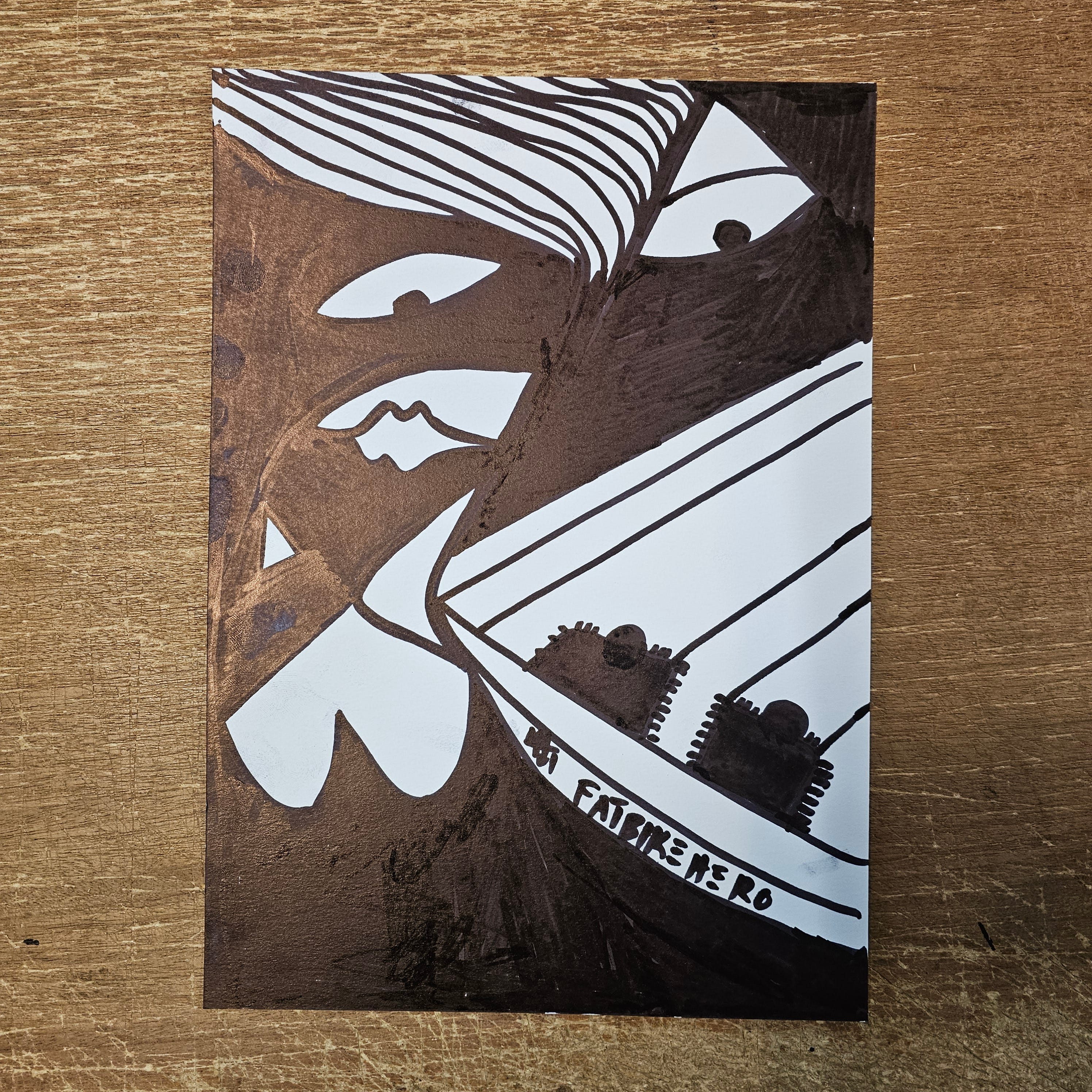 The composition is bisected by a tension between the organic curves of the face and the rigid, purposeful architecture of the lower right quadrant. Here, a vessel—resembling the prow of a ship or a mechanized carriage—cuts through the white void. Bearing the artist’s moniker, FATBIKEHERO, like a maker's mark on a hull, this vessel carries two distinct, shadowed forms. Are they passengers? Are they memories being ferried away? The interplay of the metallic bronze tones against the stark black markers creates a chiaroscuro of emotion, suggesting a character who is, as the artist notes, "quite a character"—complex, formidable, and etched with the indelible lines of experience.