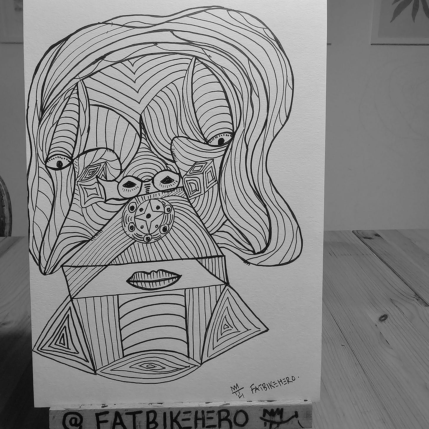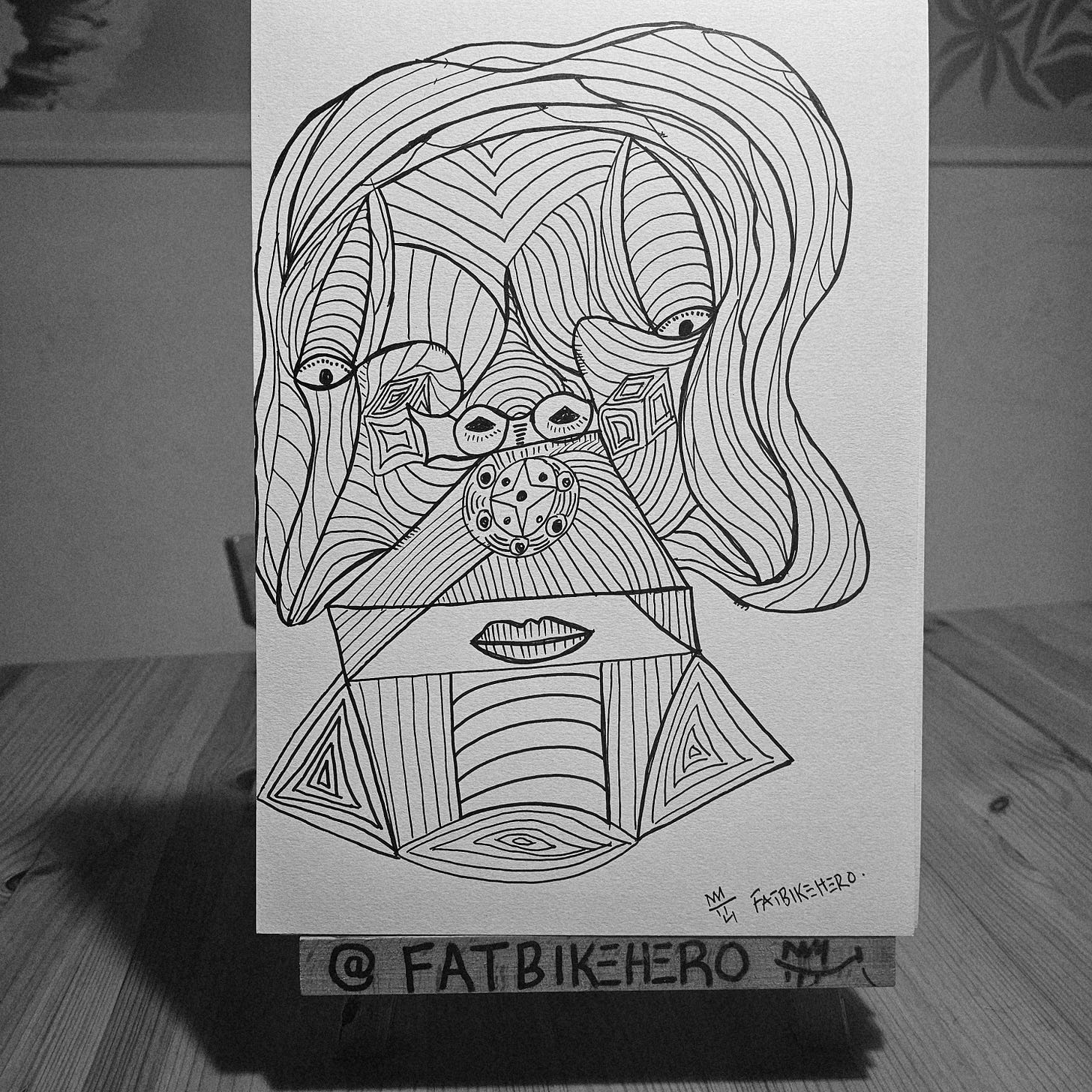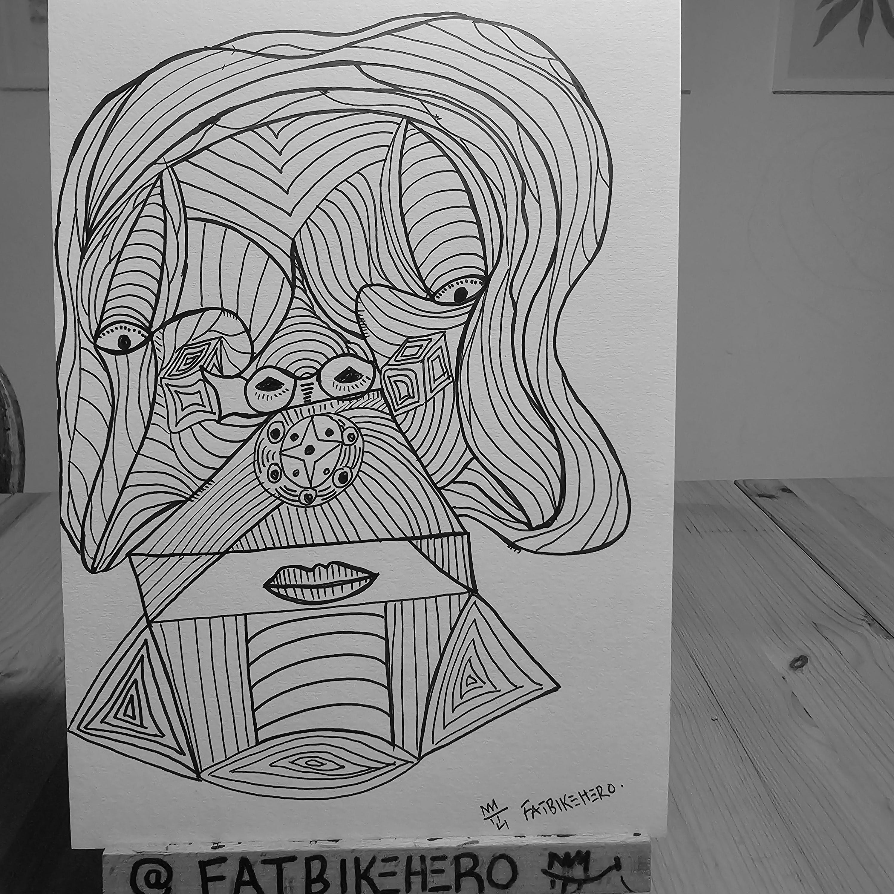 UNMASKED is a striking original drawing by the emerging contemporary visual artist FatbikeHero, executed in his distinctive graphic style. The artwork, rendered exclusively in black ink on paper, presents a compelling abstract portrait that leverages complex geometric line work to deconstruct and reconfigure the human face. This approach resonates with elements of Cubism and graphic design, while the intricate, almost meditative patterning in specific areas, such as around the eyes and the central five-pointed star motif, suggests an affinity for Zentangle or ‘doodle art’ influences.