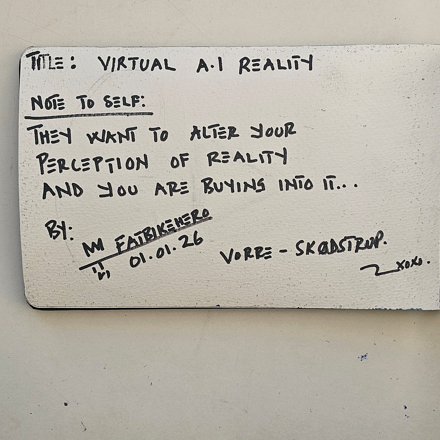Emerging from the prolific New Year's Day session in Vorre-Skodstrup, Virtual A.I Reality stands apart as the "Blue Period" of the artist’s 2026 genesis. While its contemporaries (Some Call it Bitcoin, Teehead) adhered to strict monochromatic formalism, this work explodes with electric azure and cerulean textures. The verso inscription is particularly confrontational, reading: "THEY WANT TO ALTER YOUR PERCEPTION OF REALITY AND YOU ARE BUYING INTO IT..." This textual manifesto transforms the object from a mere drawing into a piece of visual activism, directly addressing the collector's complicity in the digital age.