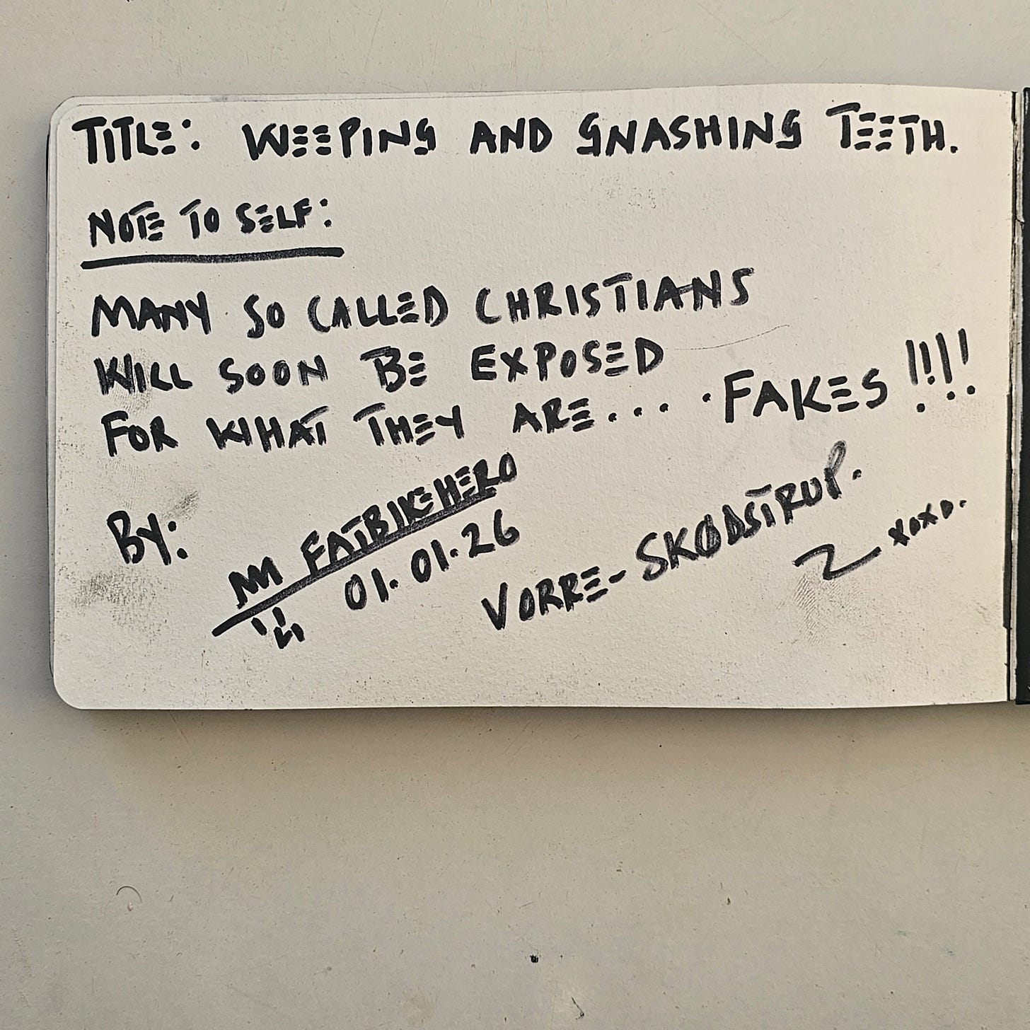 Executed on January 1, 2026, Weeping and Gnashing Teeth stands as perhaps the most confrontational work in the "Vorre - Skødstrup" sketchbook suite. While previous lots in this series addressed general existential threats or technological anxieties, this diptych levels a direct, specific accusation against institutional and personal Christian hypocrisy.